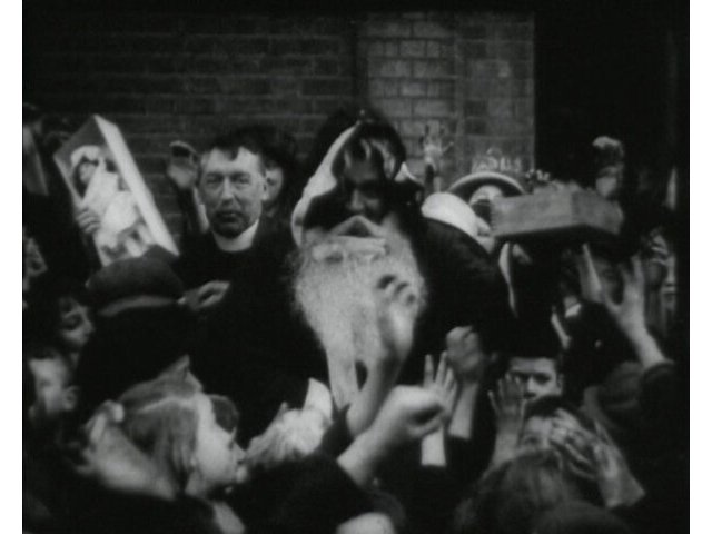Children from the East End of London, possibly Stratford, receive presents from Father Chistmas.
