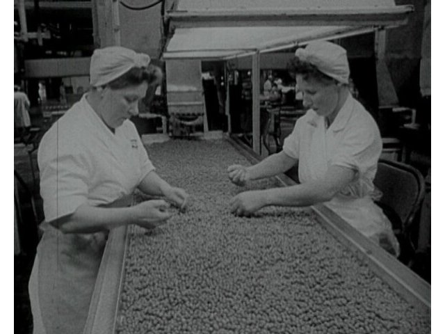 Anglia Television programme showing the work of farmers and Birds Eye factory workers at pea harvest time.
