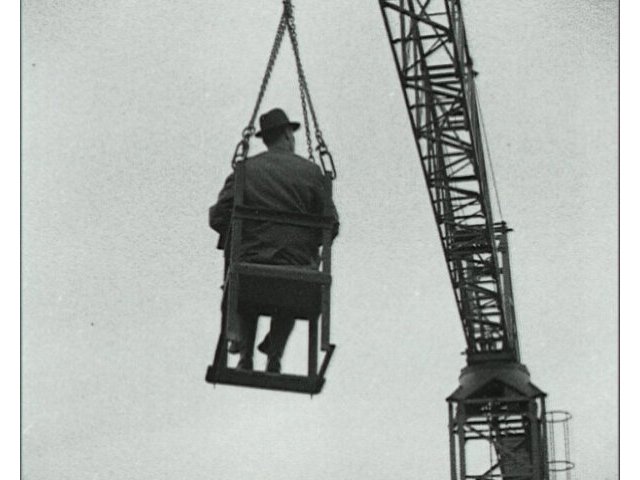 A mute Anglia Television report, Lord Townsend is winched up to the roof of the new Norwich Union building to help perform the traditional roof wetting ceremony.