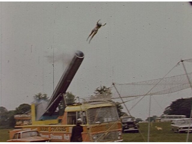 Anglia Television news report from Knebworth House where human cannonball Mary Connors completes her latest daredevil stunt.