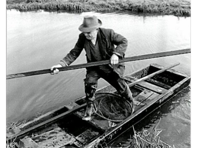Anglia Television presenter Cyril Wilkinson visits eel catcher Johnny Barnes, and is shown the skill of eel catching from the River Delph on the Cambridgeshire Fens.